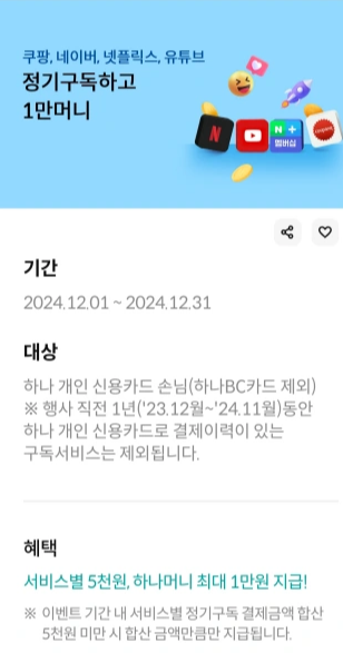 | 혜택 대상 | 하나개인신용카드손님(하나BC카드 제외),행사직전 1년동안 하나개인 신용카드로 결제 이력이 있는 구독서비스는 제외됨 |