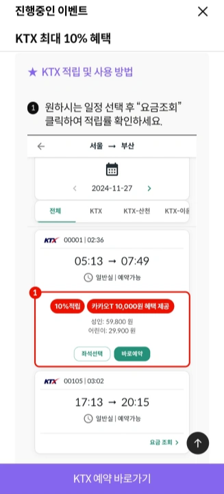 무려 10%의 적립금과 카카오 T 혜택을 주거든요. KTX예약 바로가기를 클릭하여 해당 경유를 통해서 KTX 기차표를 예매하여야 혜택을 지급받을 수 있어요.